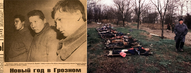 Пленные российские солдаты в начале января 1995 года. С.А. Ковалев во время опознания тел погибших. Из архива "Мемориала"