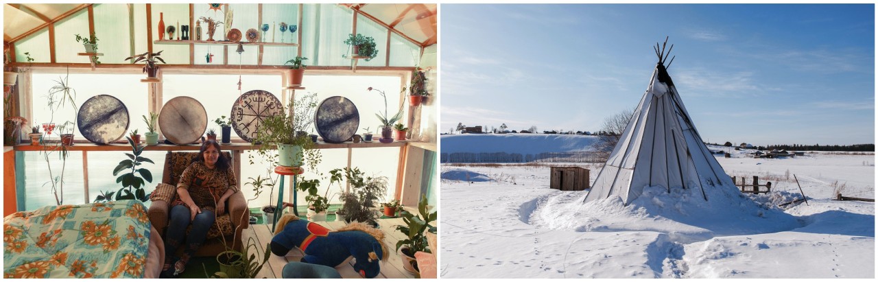 Еще несколько местных трудятся в хозяйстве у Галины Калиловой — основательницы «Центра само-открытия «Алатырь»», целительницы и эзотерика. Ее дом найти легко — она обитает и ведет приемы в похожей на оранжерею постройке из разноцветного пластика, рядом с которой высится Белый Вигвам. Но в Молёбке Галина оказалась почти случайно: