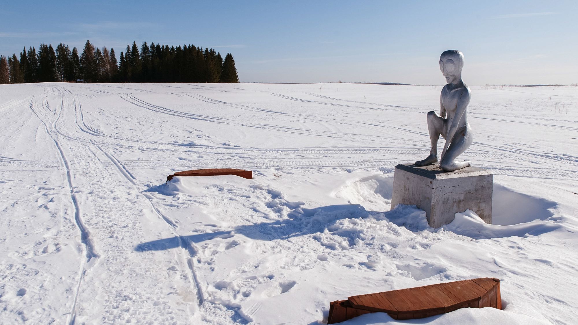 Липовка — это гора на въезде в деревню, а на ней кладбище. Там же, посреди снежного поля, стоит памятник Пришельцу. Деревянное изваяние поставили в 2011 году, а потом забросили. Только однажды покрасили серебристой краской, отчего памятник обрел совсем уж нелепый вид.