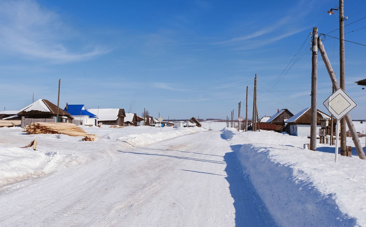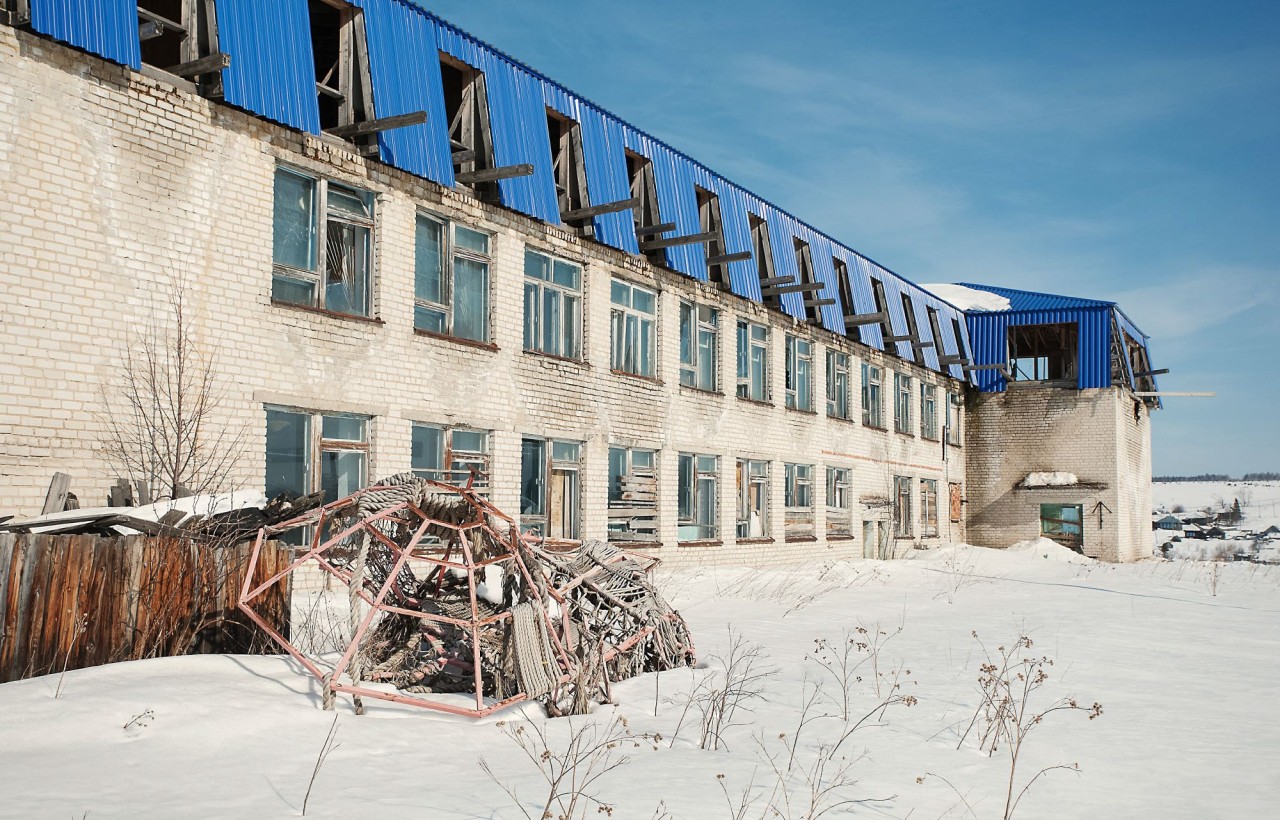 С этого ракурса даже не видно, что добрая треть домов в селе заколочена или разрушена. Детский сад и школу в селе тоже закрыли, и полтора десятка местных детей ездят учиться в соседнее Осинцево. Здание школы выходит торцом на главную площадь, где летом проходят все праздники и фестивали. На ободранном баннере, натянутом поверх выбитых окон, остался обрывок надписи: «ЭТНО-ФУТУРИСТИЧ».