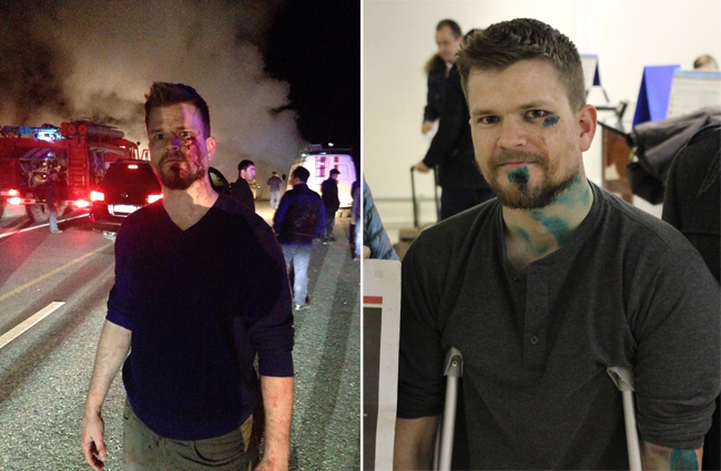Ушибы, гематомы, ссадины, с трудом двигаются пальцы на руке. Сгорели в автобусе или были похищены две фотокамеры, объективы, телефон, ключи, документы.