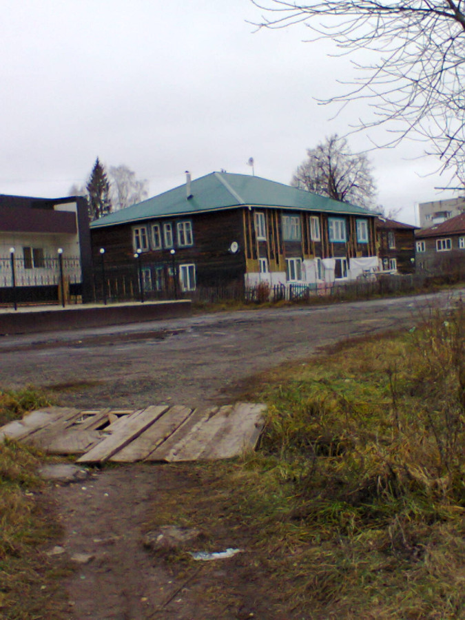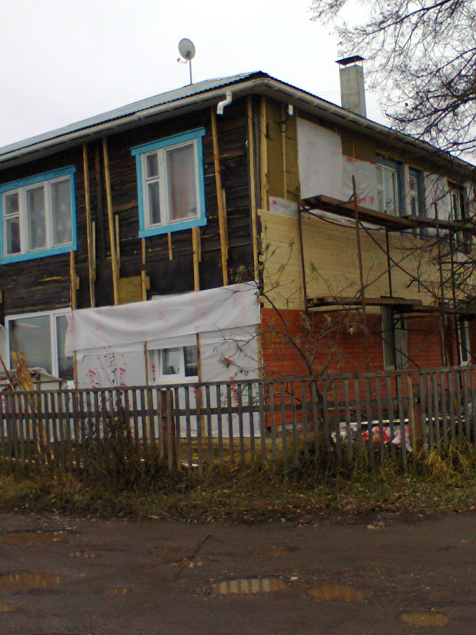 Ноябрь 2015 года, 21-ый век нанотехнологий, город Йошкар-Ола, микрорайон Ширяйково. Периодически хожу через понтонный мост в гараж и облик этого микрорайона мне знаком издавна, но всё же. Деревянный полуживой весь почерневший от старости барак расположенный на отшибе цивилизации среди таких же деревянных собратьев по несчастью, несчастью их жильцов я бы сказал, ремонтируют по программе Капитального ремонта. В Москве сносят хрущёвки а у нас тут в Йошкар-Оле ветхие бараки ремонтируют. При себе был лишь телефон - простенькая Нокия с 2 мпкс камерой, извиняюсь заранее за качество фото