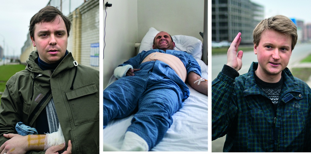 Пострадавшие. *Слева направо:*фотограф Михаил Солунин, водитель Башир Плиев, журналист Егор Сковорода. Фото: Денис Синяков/Медиазона