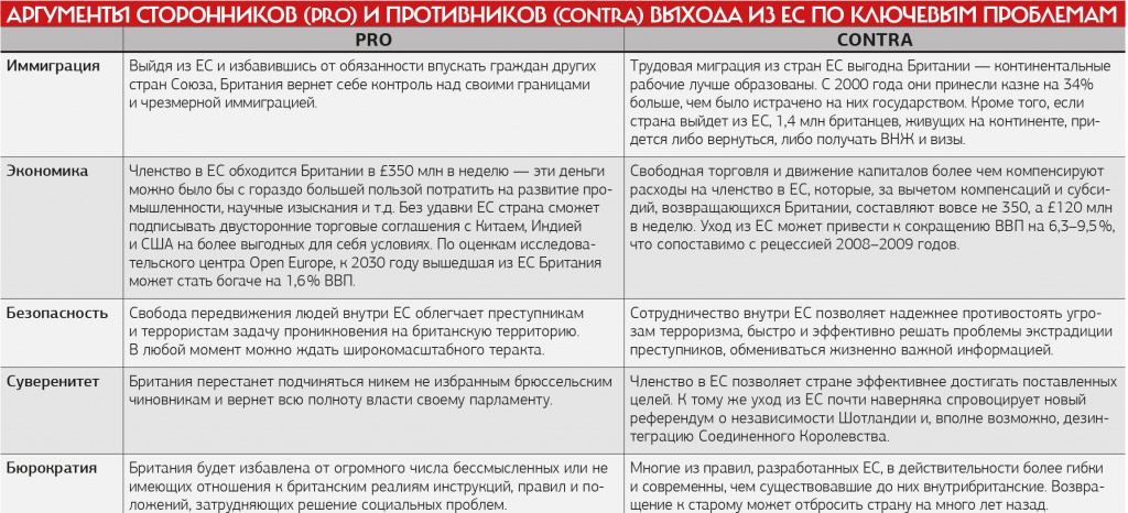 Политическая элита тоже расколота. На правом фланге правящей Консервативной партии тон задают сторонники брекзита. Среди них есть и выдающиеся личности, например, самый популярный политик страны, блистательный публицист, мэр Лондона Борис Джонсон, (которого, впрочем, многие подозревают в политических амбициях, стремлении занять кресло премьера) или старый друг и соратник Кэмерона министр юстиции Майкл Гоув. Главный аргумент Гоува и его единомышленников — необходимость защитить британский суверенитет, избавиться от власти Брюсселя. На что с противоположной стороны отвечают: Британия играла и играет одну из ведущих ролей в принятии общеевропейских решений. И вообще, мол, в современном мире абсолютного суверенитета не существует: членство в ООН, других международных организациях и сотни договоров и соглашений существенно ограничивают понятие государственной независимости. А влиятельный обозреватель, колумнист и блогер Хьюго Диксон сформулировал ту же мысль так: «Сегодня самая суверенная страна в мире — это Северная Корея».