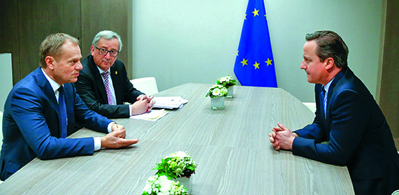 Председатели Евросовета — Дональд Туск и Еврокомиссии — Жан-Клод Юнкер обсуждают с Дэвидом Кэмероном *будущее Великобритании и, возможно, всего ЕС, Брюссель, февраль 2016 года.* Фото: AFP/east news