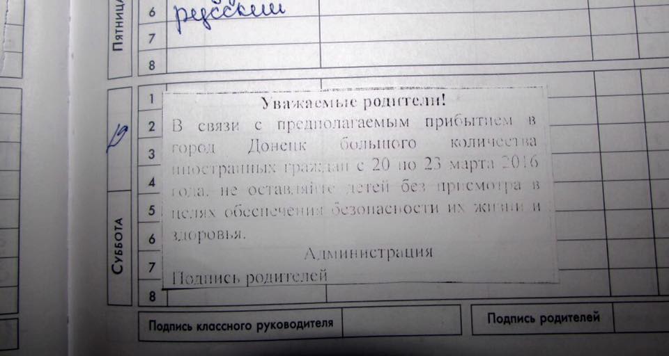 Перед выходными в дневниках донецких школьников появилась вклейка, на которой было написано: "Уважаемые родители! В связи с предполагаемым прибытием в город Донецк большого количества иностранных граждан с 20 по 23 марта 2016 года не оставляйте детей без присмотра в целях обеспечения безопасности их жизни и здоровья. Администрация".