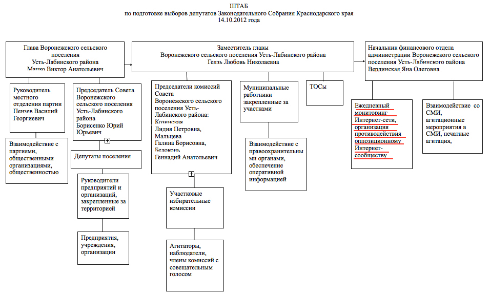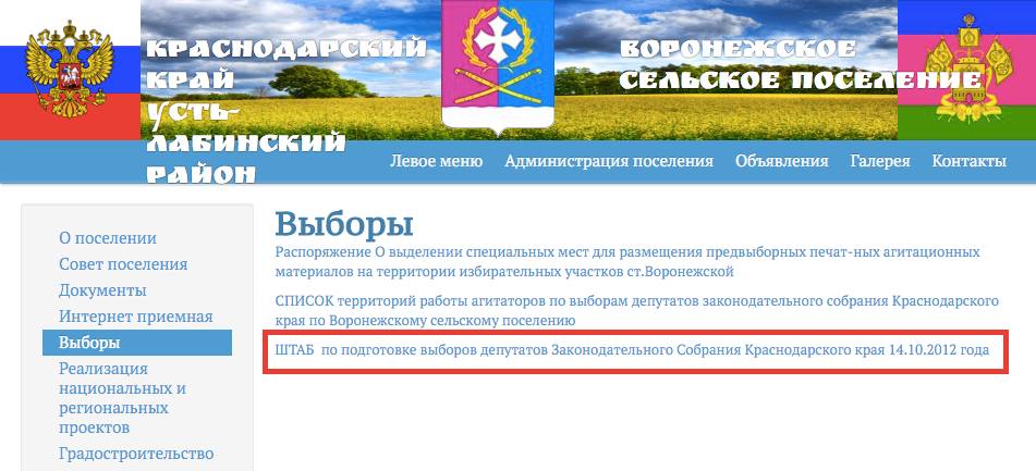Так, в официальном документе «Штаб по подготовке выборов депутатов Законодательно собрания Краснодарского края 14.10.2012», размещенном на сайте Воронежского сельского поселения в разделе выборы, закреплены противоречившие закону инструкции к чиновникам.