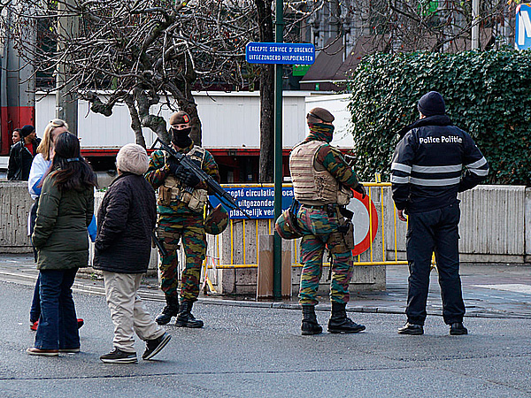 Армия и полиция на улицах Брюсселя. Photo: Miguel Discart - Flickr/CC content Miguel Discart - Flickr/CC content Сегодня утром в Брюсселе произошла серия терактов, в результате которых погибли по меньшей мере 34 человека. Информация о жертвах и пострадавших разнится, точных данных пока нет. Не менее 14 человек погибли при взрывах в зале регистрации аэропорта. Еще 20 человек погибли в результате взрыва в метро. В общей сложности пострадали более 100 человек. Журналисты передают, что город погрузился в хаос. Общественный транспорт не работает, людей попросили не выходить из домов. Объявлен максимальный, четвертый, уровень угрозы. В Брюссель стянуты военные, усилен контроль за границами.