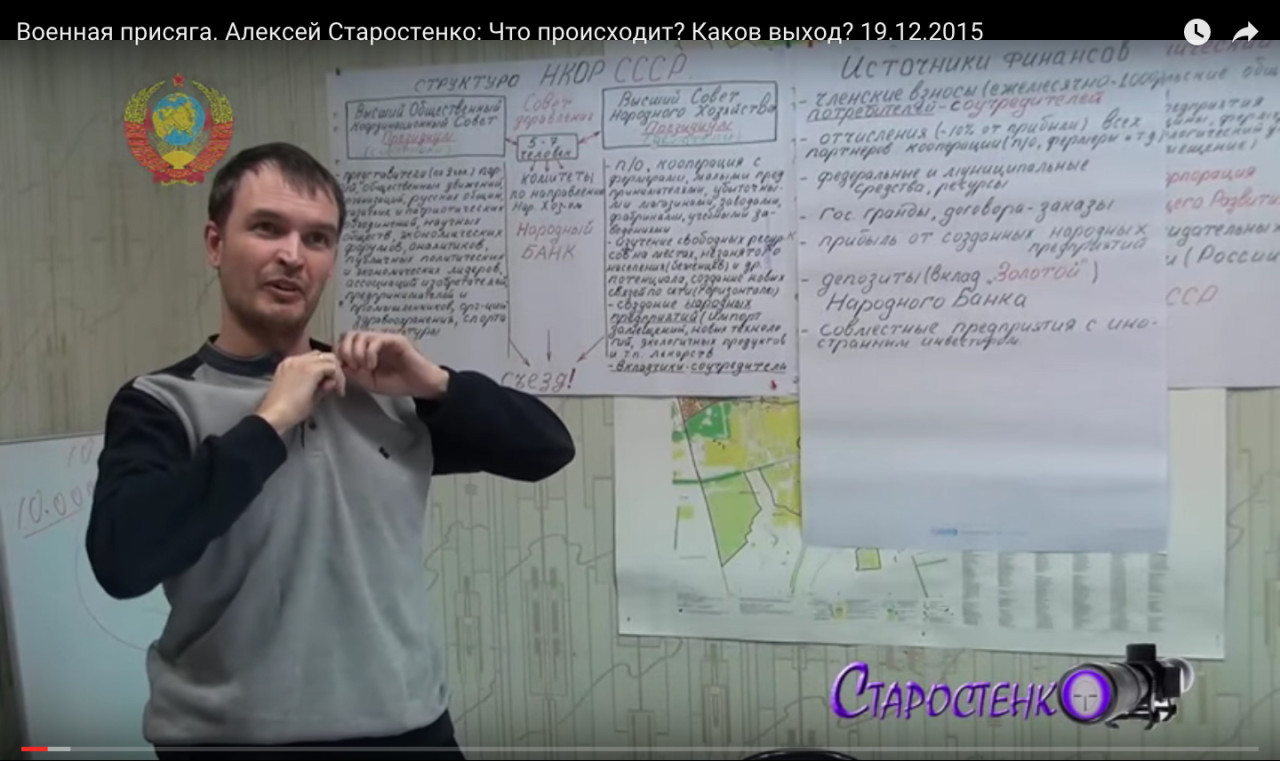 На встрече со своими сторонниками Старостенко поясняет свою картину мира: Советский Союз продолжает свое существование, а Российская Федерация и другие страны, возникшие после его развала, — это американские или еврейские корпорации, созданные для геноцида советских граждан. Выводов из этого следует масса. Например, Старостенко предлагает брать по российскому паспорту банковские кредиты и не отдавать, ведь «это не паспорт, а аусвайс».