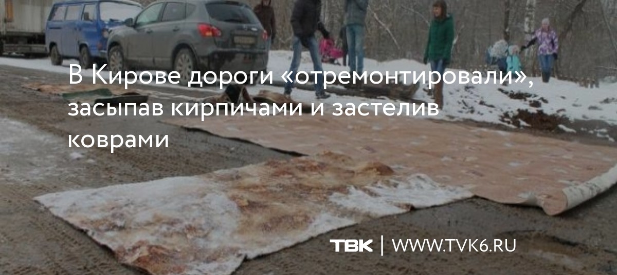 В Кирове горожане «отремонтировать» дороги засыпав ямы кирпичами и застелив коврами.