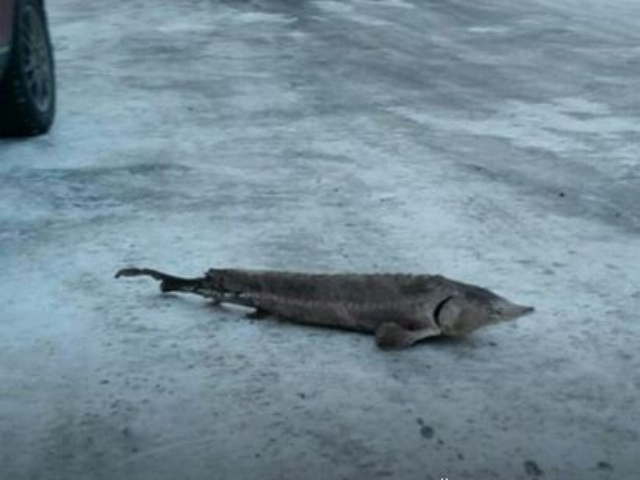Жители Норильска нашли осетра, лежащим на проезжей части в центре города.