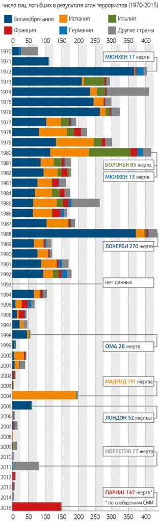 Парижский и брюссельский теракты дали самый большой за десятилетие всплеск смертности от рук террористов в Западной Европе, однако его пока трудно назвать феноменальным — в 1970-е и 1980-е годы баскские, ирландские и прочие боевики убивали в разы больше людей (см. инфографику).