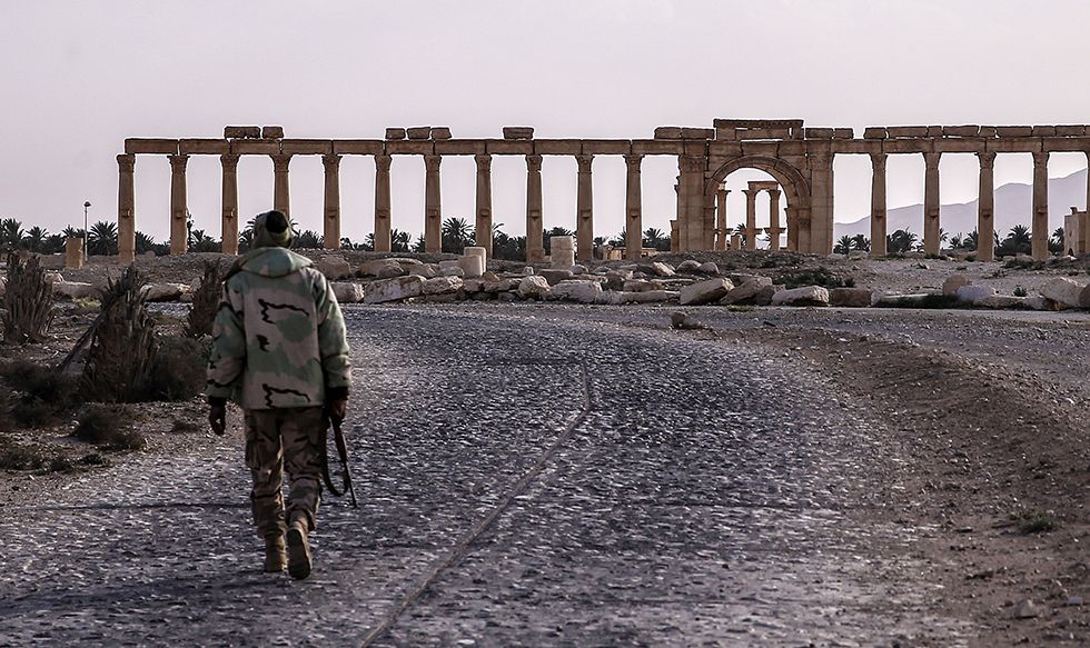 Фото: Валерий Шарифулин / ТАСС / Vida Press Солдат сирийской правительственной армии рядом с Великой колоннадой в Пальмире. 27 марта 2016 года