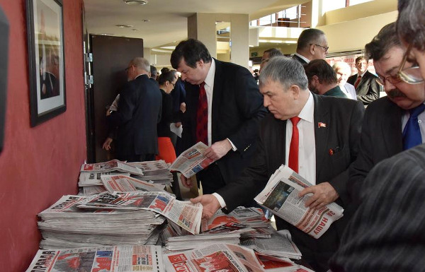 Участники X пленума ЦК КПРФ Фото Сергея Сергеева / Пресс-служба ЦК КПРФ Зато благодаря прозвучавшим на пленуме докладам уже известны экономические тезисы, с которым партия выйдет к избирателям. Это «десять антикризисных направлений»: от «избавления от доллара и ВТО, национализации энергетики, железных дорог и связи» до искоренения «гнусности антисоветизма и русофобии». Упор, впрочем, будет делаться на «народные предприятия».