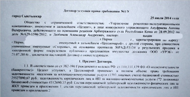 Через два года после решения Арбитражного суда РК — 25 июля 2014 года конкурсный управляющий ООО «УРЭК» заключил договор уступки права требования с жителем г.Пермь Любимовым А.А. на взыскание коммунальных долгов с населения.