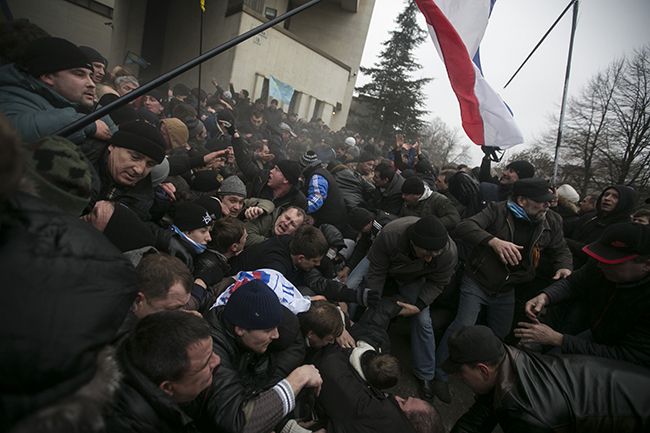 Член «Самообороны Крыма» Иван Исаев, который был на площади 26 февраля, всю вину за стычки у Верховного совета возлагает на проукраинскую сторону. «Была толкотня, меня помяли, струей газа попали в глаз, и я два дня ходил как будто песка мне туда насыпали. Это хорошо, что Аксенов поддержал мир и не дал нам самим ничего предпринять. Со стороны украинцев было много молодежи с «Правого сектора», ультрасы — и хватило бы искры, чтобы вспыхнуло. Они ждали, когда начнется мясорубка. Ими манипулировали, кричали, когда наступать — прослеживалась серьезная организация», — утверждает Исаев. По его словам, «ополчение» выполняло роль живого щита, а участники пророссийского митинга ни на кого не нападали.
