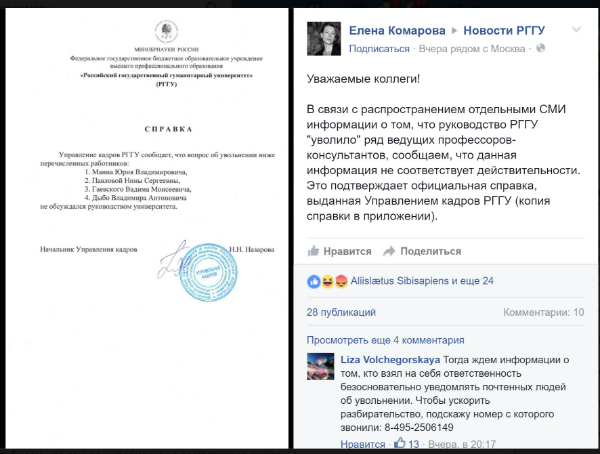 Вот такое объяснение случившемуся публиковала 29 марта 2016 года пресс-служба РГГУ: "Управление кадров РГГУ сообщает, что вопрос об увольнении ниже перечисленных работников: Манна Юрия Владимировича, Павловой Нины Сергеевны, Гаевского Вадима Моисеевича и Дыбо Владимира Антоновича не обсуждался руководством университета. Подпись: Начальник управления кадров И.Н. Назарова".