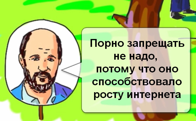 «Каждое общество проходит какие-то этапы. Говорить о легализации порно сложновато. Я не являюсь лоббистом порно, но запрещать его не надо, потому что оно способствовало росту интернета. И я не вижу в этом ничего плохого, так как иначе мы превратимся в ханжескую страну. Как при социализме, когда на экране сиська мелькнула — и мы шли толпами на этот фильм в кино. До легализации мы не дошли, но и до запретов тоже. У нас это парадокс: разрешить не можем, но и запретить не хотим».