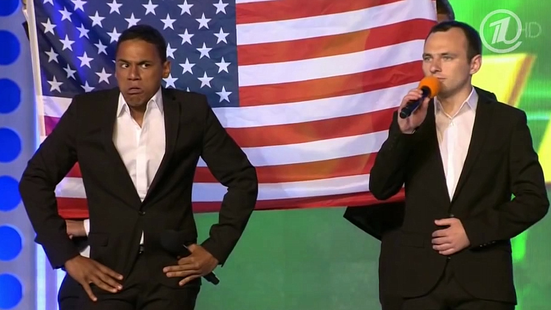 Елена Рыковцева: Я предлагаю посмотреть, как шутит о политике современный КВН. По какому-то странному стечению обстоятельств в каждой команде находится человек, похожий на президента США Обаму.