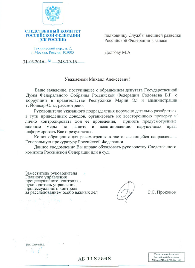 31 марта 2016 года в Госдуму пришел официальные ответ по запросу депутата Госдумы Вадима Соловьева из Следственного комитета России. Заместитель руководителя Главного управления процессуального контроля и руководитель управления контроля за расследованием особо важных дел Следственного комитета России Сергей Проконов сообщил следующее: