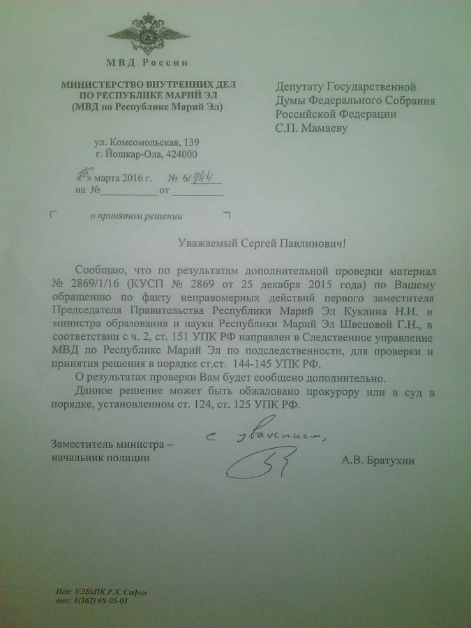 Заместитель министра внутренних дел Марий Эл Андрей Братухин также сообщил, что Следственное управление МВД начало проверку по фактам неправомерных действий первого заместителя Главы Марий Эл Николая Куклина и министра образования и науки Марий Эл Галины Швецовой.