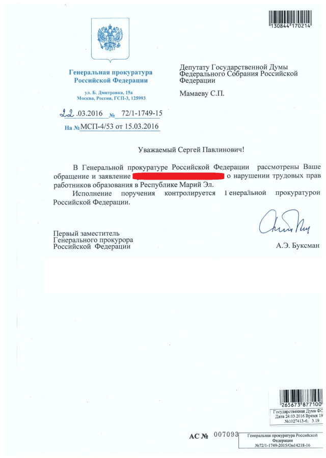 Первый заместитель Генерального прокурора России Александр Буксман сообщил депутату Госдумы, что начато проверка причин нарушения трудовых прав работников образования в Марий Эл. Исполнение поручения контролируется Генеральной прокуратурой.