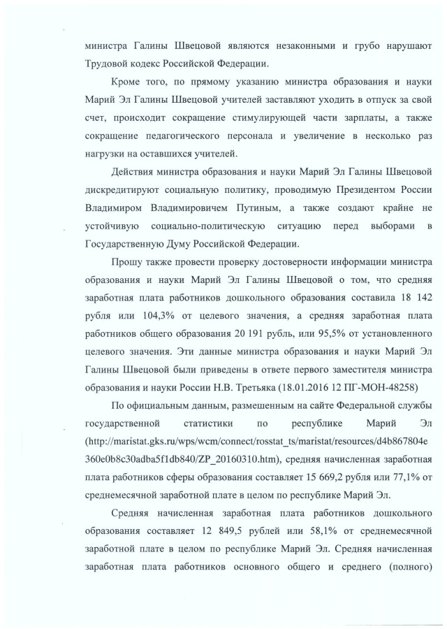 В январе 2016 года зарплата работников образования республики Марий Эл снизилась на 1 тысячу рублей по сравнению с январем 2015 года. Сокращение фонда оплаты труда педагогов республики, на 12% по сравнению с 2015 года произошло по прямому указанию министра образования и науки Марий Эл Галины Швецовой. Распоряжения и действия министра Галины Швецовой являются незаконными и грубо нарушают Трудовой кодекс Российской Федерации.