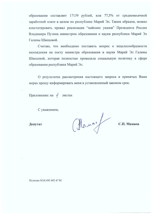 Действия министра образования и науки Марий Эл Галины Швецовой дискредитируют социальную политику, проводимую Президентом России Владимиром Владимировичем Путиным, а также создают крайне не устойчивую социально-политическую ситуацию перед выборами в Государственную Думу Российской Федерации.