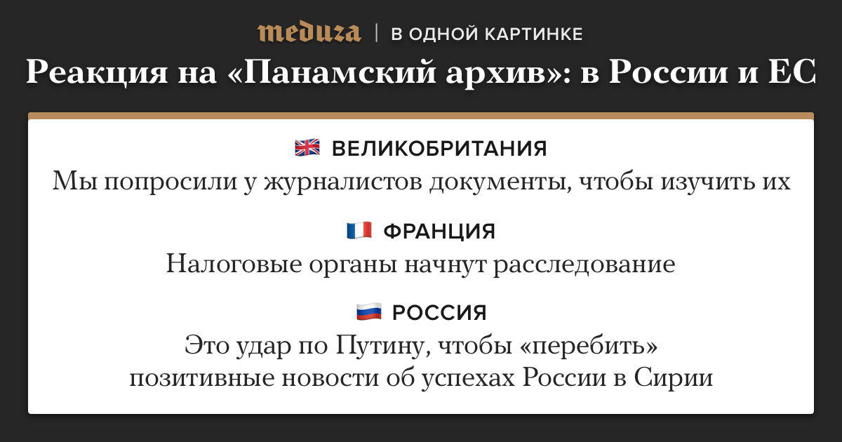 Фото в анонсе: Михаил Климентьев / RIA Novosti / Reuters / Scanpix «Панамский архив» — это документы панамской компании, которая занимается регистрацией офшоров. В результате международного расследования выяснилось, что офшоры были или есть у 12 мировых лидеров; офшоры с многомиллиардным оборотом есть у близкого друга Владимира Путина; компании в офшорных юрисдикциях зарегистрированы и на российских чиновников, в том числе на жену Дмитрия Пескова. Именно он автор комментария от лица российских властей. «Медуза» следит за реакцией на самую большую утечку документов в истории.