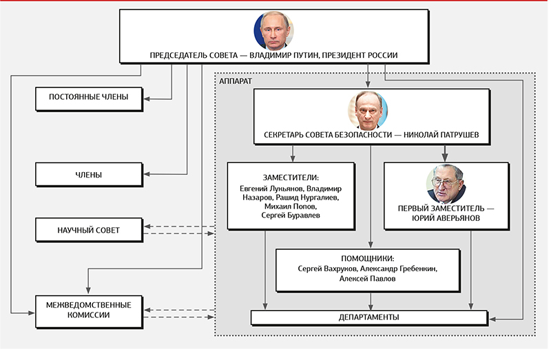 Принцип назначения постоянных членов Совета безопасности — это отсутствие принципа. С одной стороны, в его состав входит руководитель администрации президента (Иванов), председатель правительства (Медведев), председатели Совета Федерации (Матвиенко) и Государственной думы (Нарышкин), руководители силовых министерств — обороны (Шойгу), ФСБ (Бортников), внутренних дел (Колокольцев), Службы внешней разведки (Фрадков) и МИДа (Лавров), то есть так называемых «министерств со звездочкой», которые подчиняются непосредственно президенту, а не председателю правительства. Естественно, постоянным членом Совбеза является и его секретарь, генерал армии Патрушев.