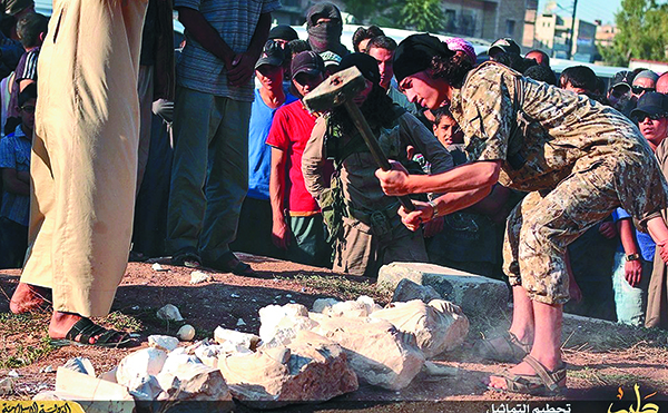 Снимок, распространенный по онлайн-каналам пропаганды ИГ*: молодой джихадист разбивает молотом античные артефакты, похищенные в Пальмире, Манбидж, Сирия, июль 2015 года