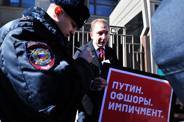 Четыре политических активиста и один случайный прохожий задержаны во время пикета за импичмент Владимиру Путину по итогам «панамского офшорного скандала»
