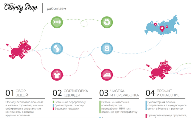 – Дизайн для Charity Shop! У нас есть ряд клевых плакатов и инфографик, описывающих процесс работы. Есть единорог, который покорил тысячи сердец. А сейчас мы делаем оформление больших железных контейнеров для сбора одежды. И сайт – тоже наших рук дело.