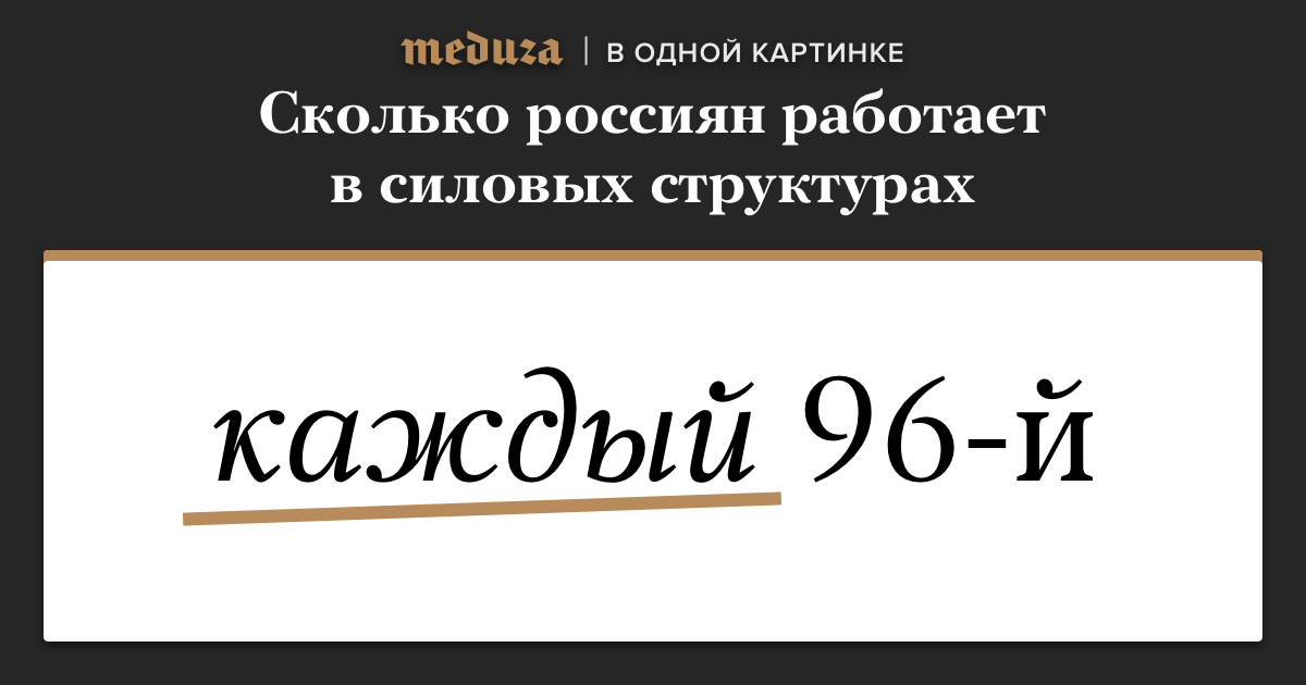 Фото в анонсе: Артем Коротаев / ТАСС Для подсчета мы сложили предельную численность всех силовых ведомств России, в том числе МВД, Следственного комитета РФ, прокуратуры, МЧС и новообразованной Национальной гвардии. Население России для расчетов взято на 1 января 2016 года. В действительности, силовиков в России может быть даже больше, потому что данные о численности ФСБ, ФСО и СВР засекречены и нами не учитывались.