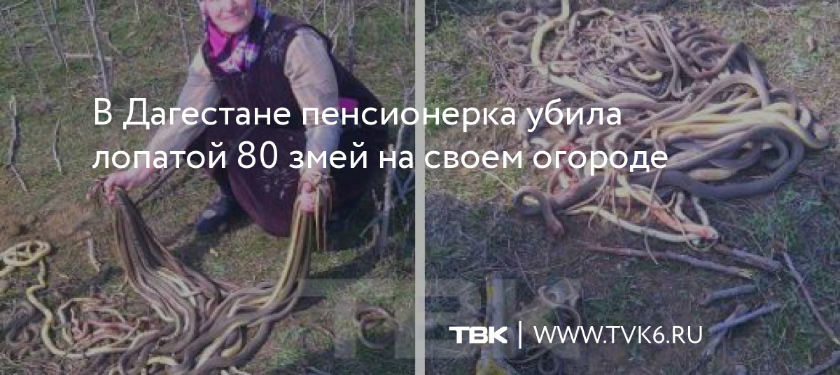 Жительница дагестанского с. Темиргое Сагиб Исламмагомедова лопатой убила около 80 змей на своем участке. Женщина случайно наткнулась на логово рептилий, когда сажала картошку, сообщает 6 апреля КП.