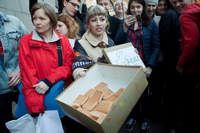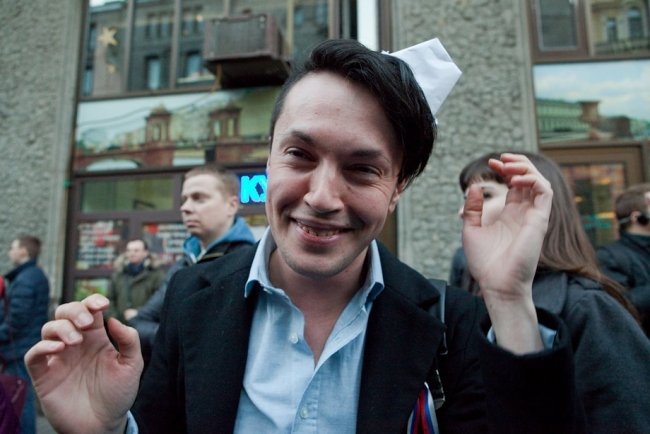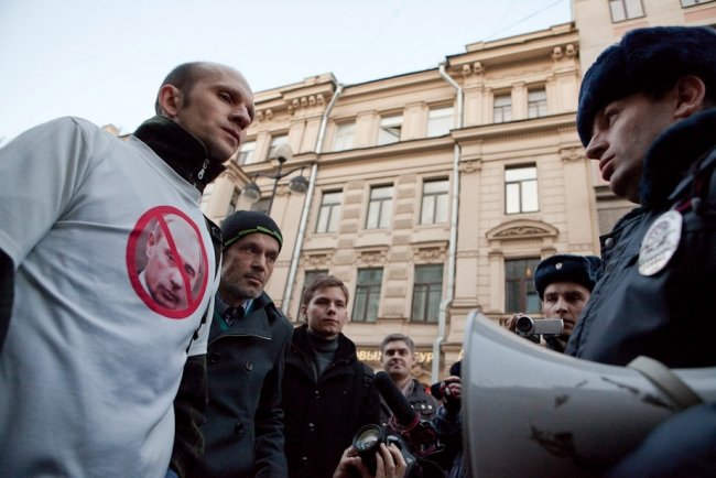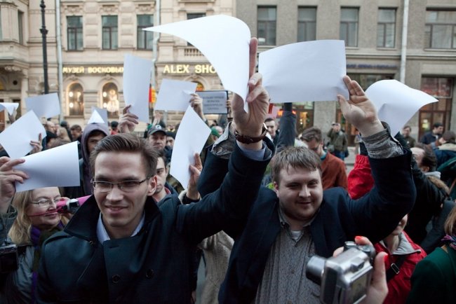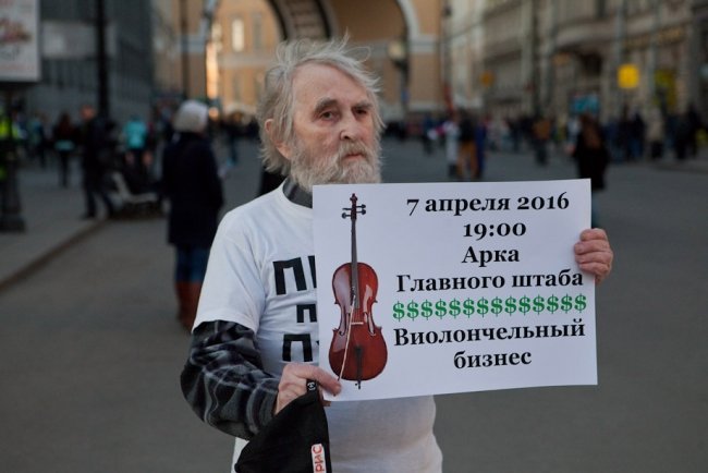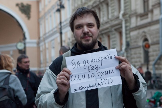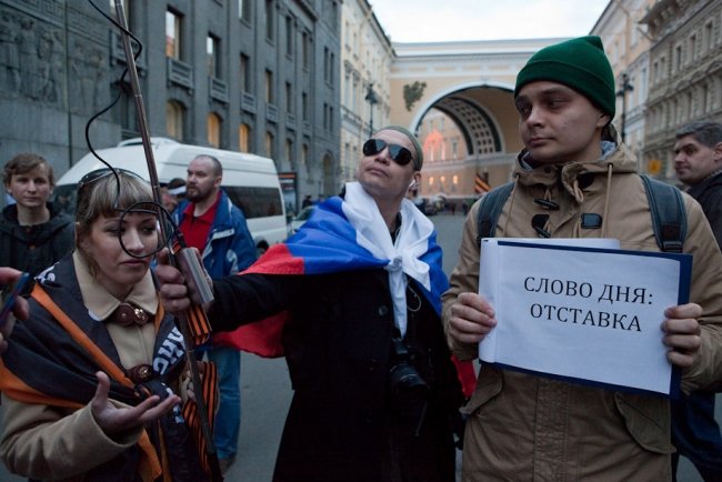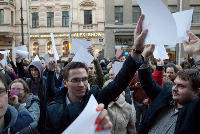 "Данное мероприятие проводится с нарушением ФЗ-54, вы будете задержаны и доставлены в органы внутренних дел за невыполнение законных требований полиции", – привычно бубнит в мегафон полиция, но в итоге обошлось без задержаний. Кроме листов, в толпе мелькают плакаты "Слово дня – отставка", "За демократию без олигархии", "Возьму уроки игры на виолончели, срочно", украинский и ингерманландский флажки на рюкзаке у Константина Ершова из "Демократического Петербурга".
