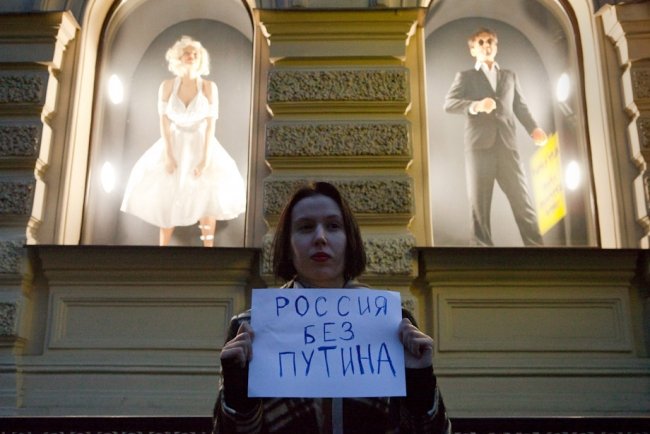 Через дорогу от них активистка разворачивает плакат "Путин – х*лло!", на нее никто не обращает внимания. Пара человек в бумажных панамах, в честь панамских офшоров, но массового шапочного флэшмоба не было. В глаза бросается футболка с надписью: "Путину не нужно время, Путину нужен срок". Участники акции раздают пустые белые листы бумаги – люди синхронно поднимают их вверх.