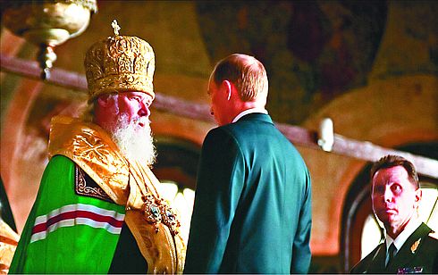Даже во время беседы с патриархом Золотов охраняет президента, Москва, 7 мая 2004 года