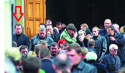 Виктор Золотов (крайний слева) на похоронах Романа Цепова, которого считали в Петербурге криминальным авторитетом, Санкт-Петербург, 27 сентября 2004 года