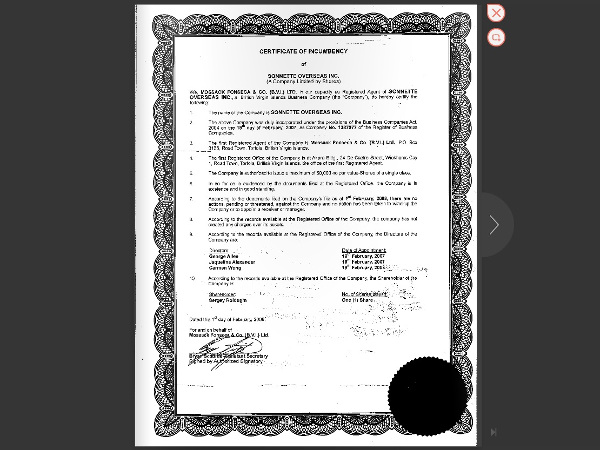 Свидетельство о полномочиях, выданное компанией Mossack Fonseca 1 февраля 2005 года, где указаны сведения о единственном акционере компании Sonnette Overseas Источник