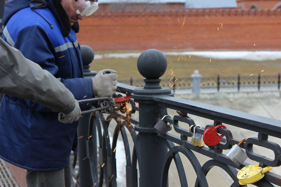 Рабочие при помощи «болгарки» за 8–11 апреля срезали сотни замков, которые молодожены оставили на перилах одного из пешеходных мостов столицы Марий Эл, — сообщает корреспондент «7x7».