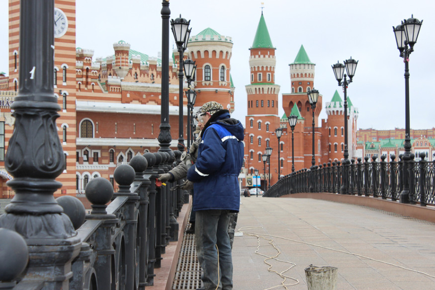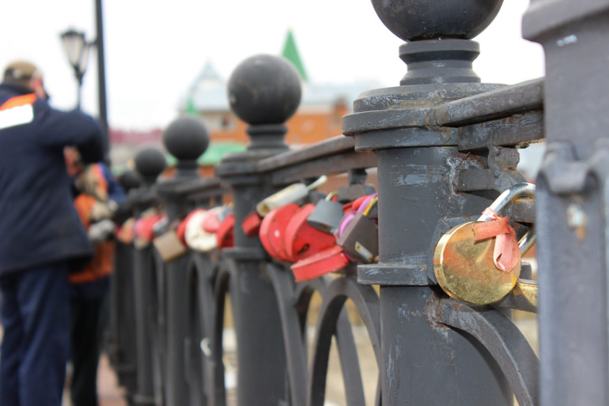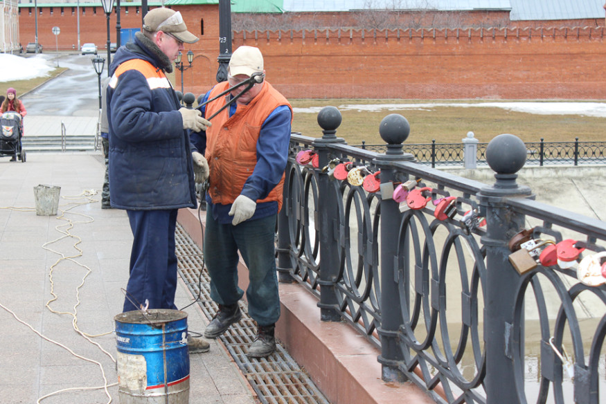 Неожиданный старт благоустроительных работ в центре города: городские службы первым делом решили освободить пешеходный Воскресенский мост от многочисленных замков, которые по традиции оставляет практически каждый свадебный кортеж, приезжающий на набережную в центре Йошкар-Олы. Работы начались, как сообщают местные СМИ, в минувшую пятницу, 8 апреля. 11-го апреля на мосту работали две группы рабочих с «болгарками». Срезанные замки они складывали в различные емкости и мешки.