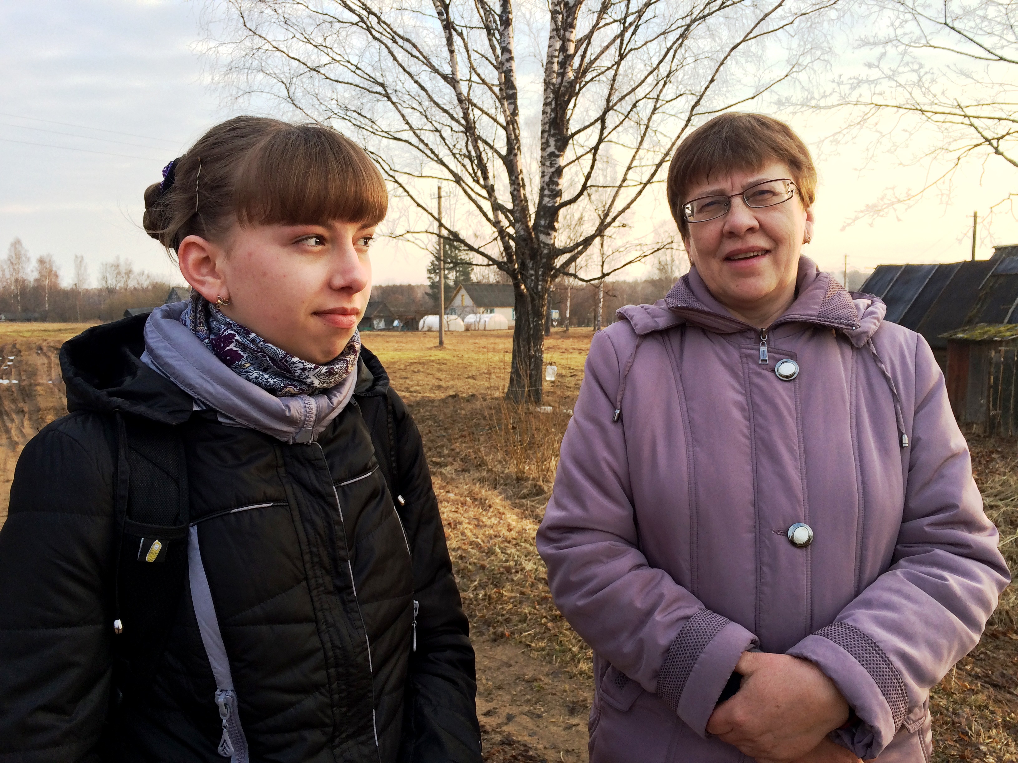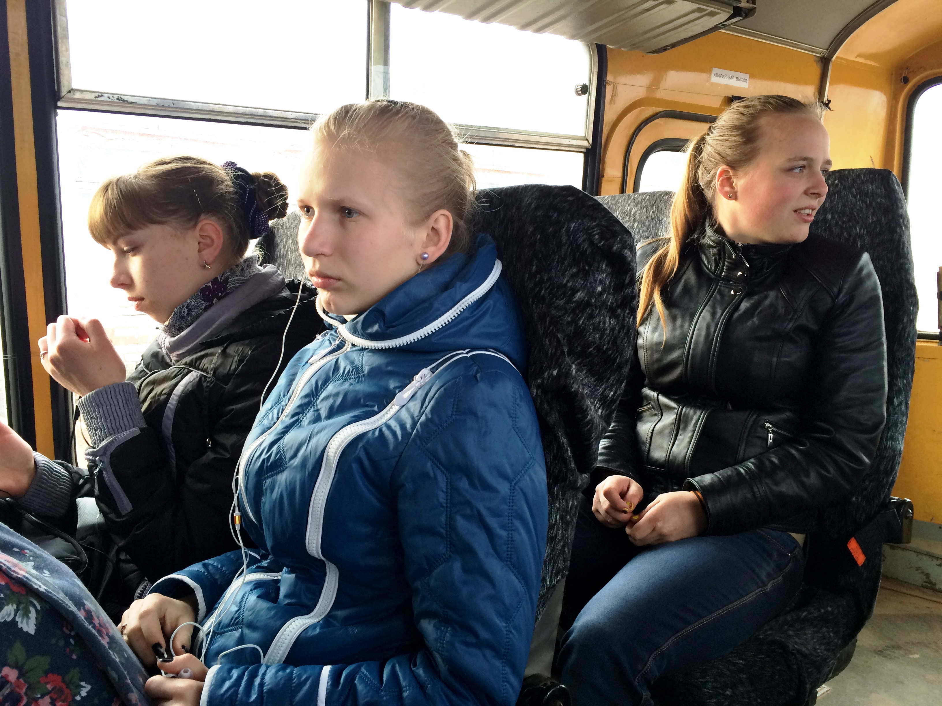 В апреле в 7 часов утра уже светло и Настя Шаркова выходит на деревенскую дорогу одна. Зимой, в темноте, ее провожает мама с фонариком – никакого освещения в деревне Кресты нет. В 7:20 подходит автобус, и Настя занимает любое, какое ей понравится, место – следующий пассажир зайдет только через 8 километров в деревне Долговицы. Это будет одноклассница Дина; девочки поздороваются и на час с лишним включат музыку через наушники – все равно в тряске и шуме разговаривать невозможно.
