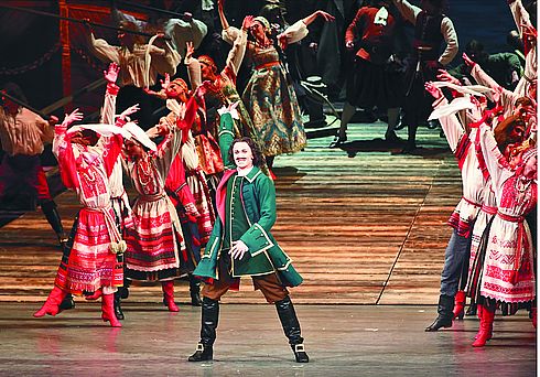 Мы, наверное, любим, когда на балетную сцену выходит духовой оркестр и нестройно, но с энтузиазмом поет «Соловей, соловей, пташечка». Когда Петр на корабельной стройке гоняется за каким-то мужиком и таки отчекрыживает тому бороду саблей (пушкинский сюжет излагается во втором и третьем действиях балета, в первом — царь строит Петербург). И когда Параша (Виктория Терёшкина) сто пятнадцать раз объясняет нам, что она русская, русская, русская девушка: лебединые взмахи, земные поклоны, сплетаемая ногами «косичка» в тот момент, когда руки сложены перед грудью… (Словарный запас Эллочки-людоедки — кроме арабесков и туров пике других «слов» эта героиня не знает.)