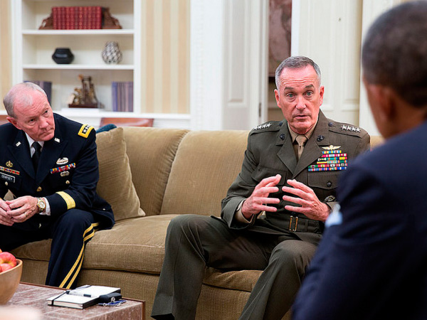 Американские военные на приеме в Овальном кабинете. Фото,:Pete Souza/Official White House photostream После этого официальное обсуждение плана продолжилось. Участники возглавляемой США коалиции получили от ЦРУ обещание, что в случае обострения им разрешат увеличить поддержку умеренной сирийской оппозиции. К настоящему моменту, сообщается в последнем материале WSJ на эту тему, план в общих чертах намечен. Осталось только, чтобы Белый дом утвердил список вооружений, которые могут быть предоставлены боевикам в случае введения плана «Б».
