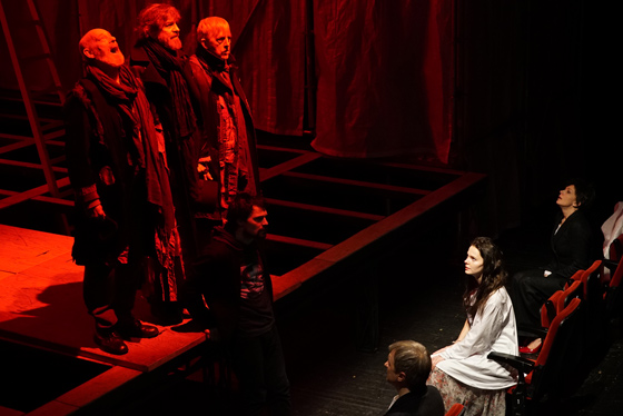 Так что вопрос, кого играет Игорь Иванов, почти до самой премьеры бурно обсуждавшийся в околотеатральных кругах, — в десятку. Ответ на него и есть ключ к действию. Иванов играет себя — большого артиста и alter ego создателя спектакля. Это именно они — Сергей Курышев, Сергей Козырев и Игорь Иванов — заставляют звучать текст Шекспира как газетную передовицу: «Купи себе стеклянные глаза — и делай вид, как негодяй-политик, что видишь то, чего не видишь ты». Это он, Игорь Иванов, которого в спектакле зовут Марцелл по имени караульного из шекспировского «Гамлета», вдруг с помощью одного из монологов короля Лира меняет угол отражения всего, что происходит в спектакле, — и оправдывает грех прелюбодеяния с той легкостью, с какой фокусник вытаскивает из цилиндра зайца. Делает он это, всего лишь вглядываясь в свою пустую ладонь, на которой якобы в этот миг тому самому греху предаются мушки, что доказывает абсолютную естественность подобного акта. Впрочем, в следующую секунду угол отражения меняется снова: крик Марцелла — Иванова «Совокупляйтесь! Мне нужны солдаты» возвращает всех в очень конкретную реальность. А потом снова и снова — до бесконечности. Кажется, три этих актера могли бы таким образом перечитать всего Шекспира, преображая слова, слова, слова в сокрушительно сегодняшние смыслы и подтексты.