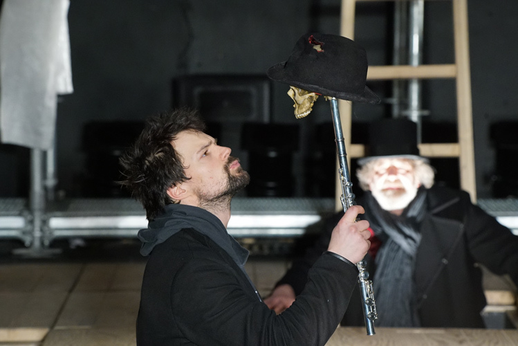 © МДТ — Театр Европы Впечатляет также особая роль, отведенная в спектакле собственно шекспировскому «Гамлету» — маленькой книжечке в обложке, копии той, с которой больше десятилетия, по его собственному признанию, не расставался Додин. Это именно из нее, а вовсе не из неведомого зрителям XXI века «Убийства Гонзаго» Гамлет, одержимый идеей напугать мать, а не «заарканить совесть короля» (здешний мягкотелый Клавдий вовсе ни на что не способен, кроме, вероятно, постели), выбирает цитаты для пьесы. Это в нее Гамлет прячет кружевные трусики Офелии (прилетевшие неведомо откуда в качестве приглашения отложить ненадолго дела ради наслаждения). Это из нее потерявшая рассудок Офелия будет вырывать странички и дарить королю и королеве под видом фиалок и розмарина. Это в ней Гамлет — Козловский найдет хрестоматийный монолог «Быть или не быть» и попробует его прочитать, взобравшись на лестницу, как дети забираются на табуреточку. Монолог, хотя принц будет его читать очень старательно, что называется, не прозвучит. Никаких других знаменитых (чтобы не сказать — шедевральных) монологов Додин Гамлету — Козловскому читать уже не даст. И не потому (точнее, не только потому), что сила этих текстов так велика, что оправдает, пожалуй, и убийства. Фундаментальная идея режиссера станет ясна буквально сразу, как только шекспировский текст зазвучит из уст профессиональных актеров, которых в этом спектакле играют безусловные мастера. Так вот, как только Игорь Иванов, Сергей Курышев, Сергей Козырев займут свои места на трех лестницах, возвышающихся над сценой, и, проговорив походя свои меркантильные тексты про то, как малоталантливая, но претенциозная молодежь наступает им на пятки, начнут изъясняться шекспировскими рифмами, обнаружится простая истина: политики, кроме прочего, — еще и отвратительные актеры. На фоне театральных профи их (политиков) комбинации выглядят чванливой самодеятельностью, плохо скрывающей истинную суть и самих политических фигурантов, и их поступков.