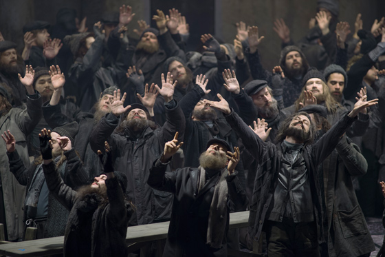 Круговой мизансцене нужна ось: геометрия первого акта замкнута на фигурах Гурнеманца и Амфортаса, второго — на фигурах Клингзора и Кундри. В центре композиции третьего акта должен был бы оказаться Парсифаль — но «чистый простец» отнюдь не желает становиться новым мессией и лидером «хранителей Грааля». Распад круговой мизансцены после его ухода становится главным coup de théâtre берлинского спектакля: стройная система превращается в ризому, в лишившуюся центра и смысла колышущуюся человеческую массу, простирающую руки в пустоту в попытке нащупать точку опоры.