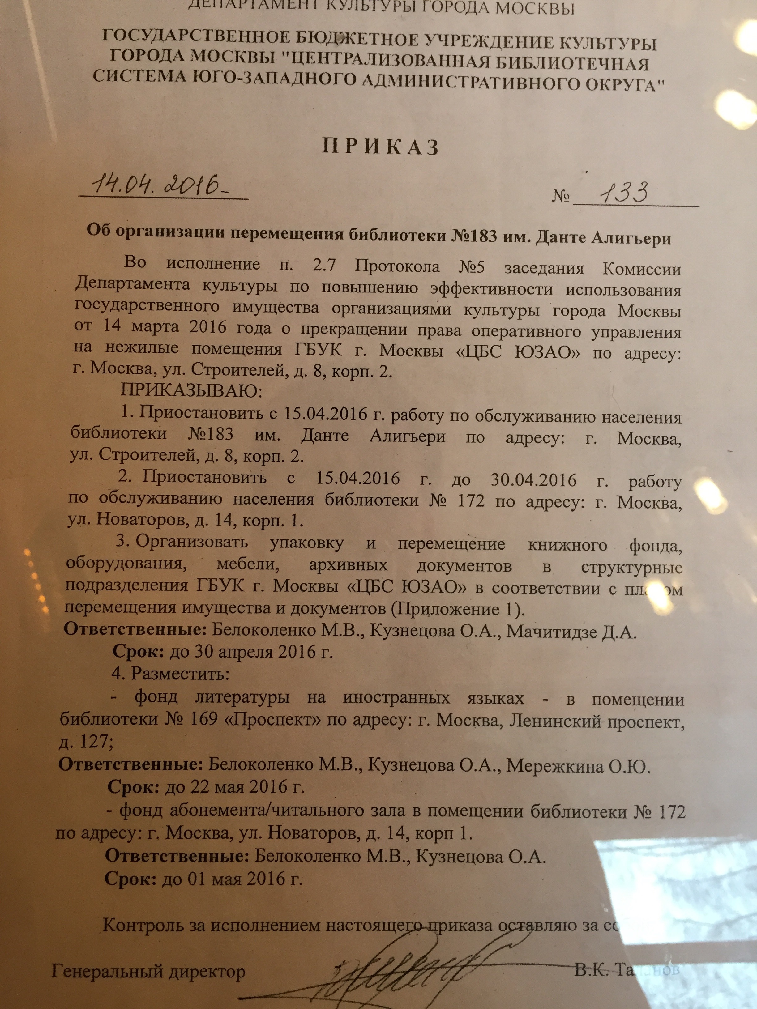 Приказ департамента культуры Москвы "Об организации перемещения библиотеки №183" был выпущен 14 апреля. 15 апреля, в пятницу, работники Центральной библиотечной системы по ЮЗАО уже начали вывозить технику. Для местных работников и читателей это стало шоком.