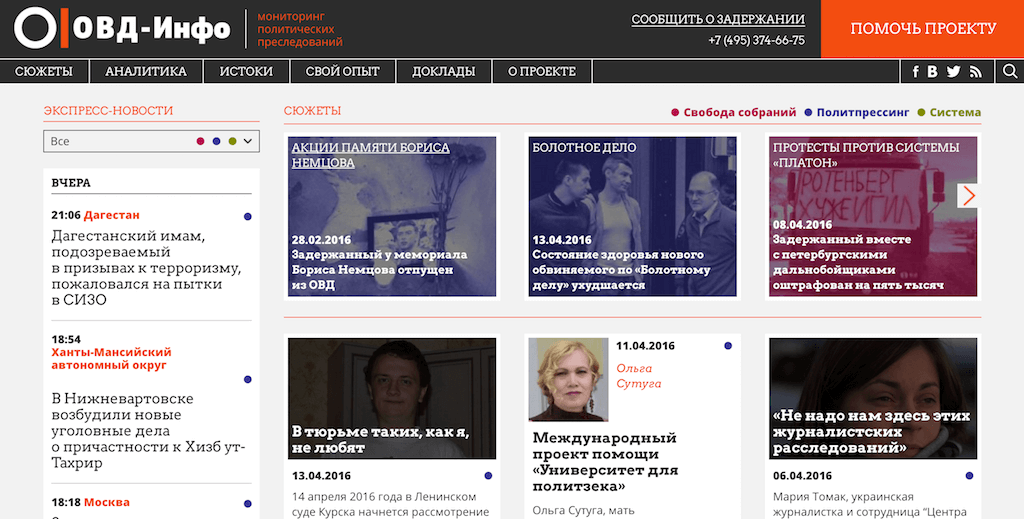 «ОВД-Инфо» – волонтерский сайт, с 2011 года оперативно мониторит информацию о задержаниях на массовых протестных акциях и других видах политического преследования.